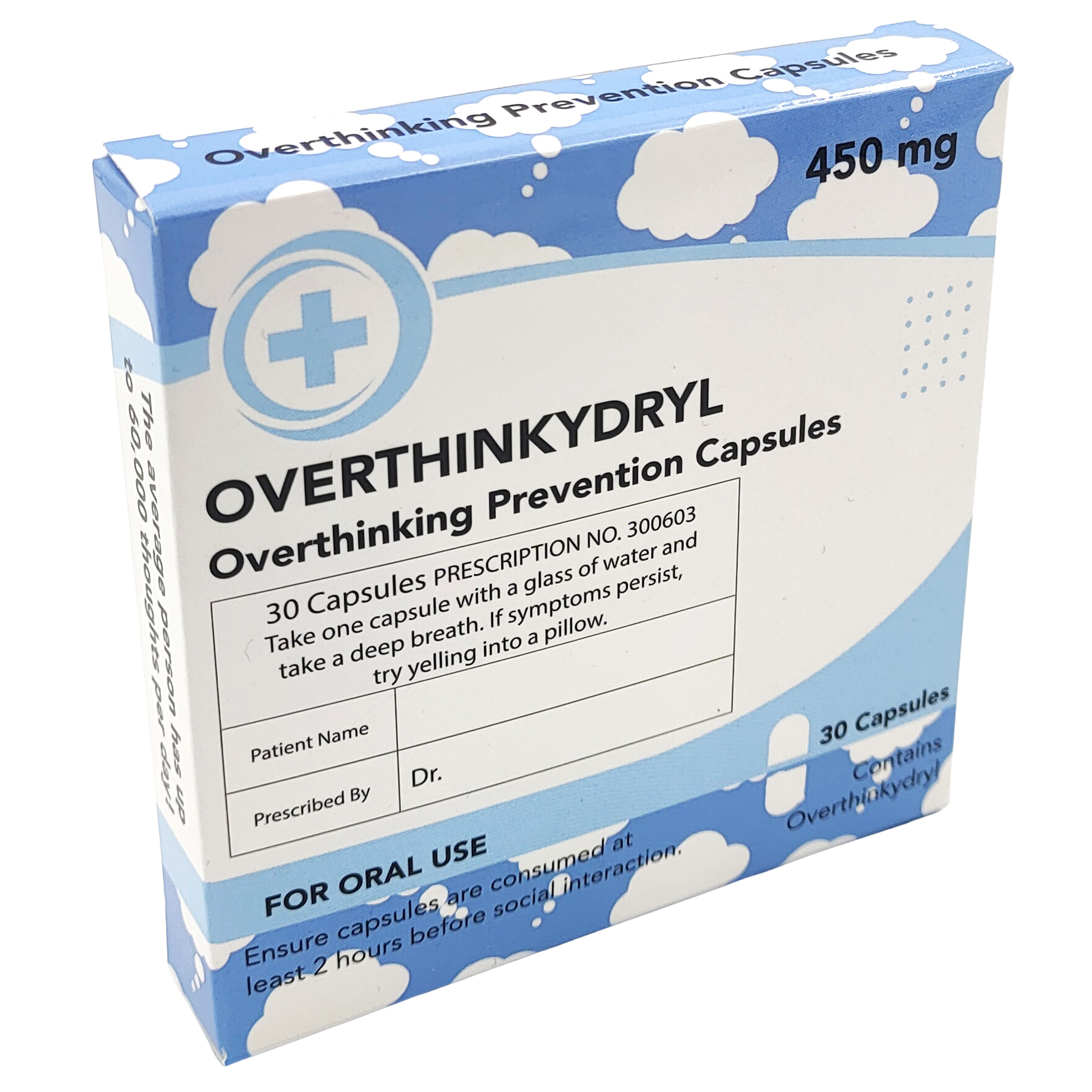 Looking for the perfect gift for someone who can’t stop spiralling over literally everything? Overthinkydryl is the fake prescription they absolutely don’t need – a ridiculous remedy for chronic overthinking. Styled like a real medicine box but filled with nothing more than mints, it’s a hilarious gag gift for your most overanalytical mate. Ideal for birthdays, Secret Santa, or anyone who needs to chill the hell out.