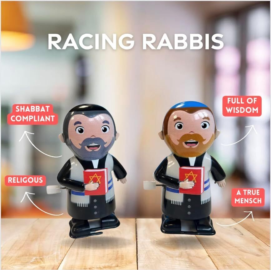 Put your gelt where your mouth is and place your bets on the Racing Rabbis – the only wind-up rabbis bringing high-speed Torah study to your tabletop! This hilarious duo includes two rabbis, one with a majestic ginger beard and one with a wise grey beard, both ready to schlep at surprising speeds.